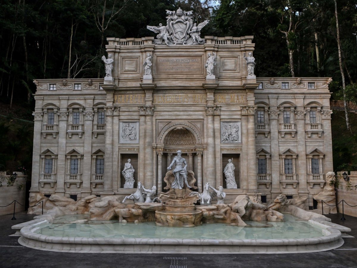 Pero si te fijas hay árboles detrás. Lo cual no tiene sentido, porque efectivamente es un COPIA. Está en Brasil. Es más pequeña, las esculturas no son de mármol, pero para las fotos no se nota. Supongo que la gente tirará monedas igualmente. |